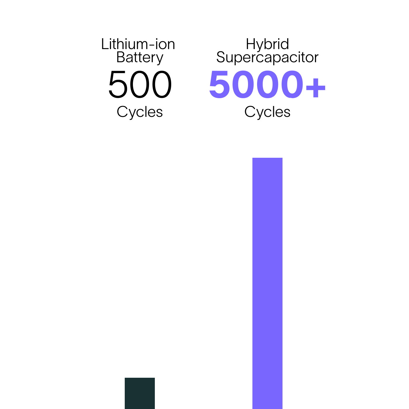 No more fires related to lithium-ion batteries. Hybrid supercapacitors completely eliminate thermal runaway, even in the event of a fall, crushing, or short circuit.