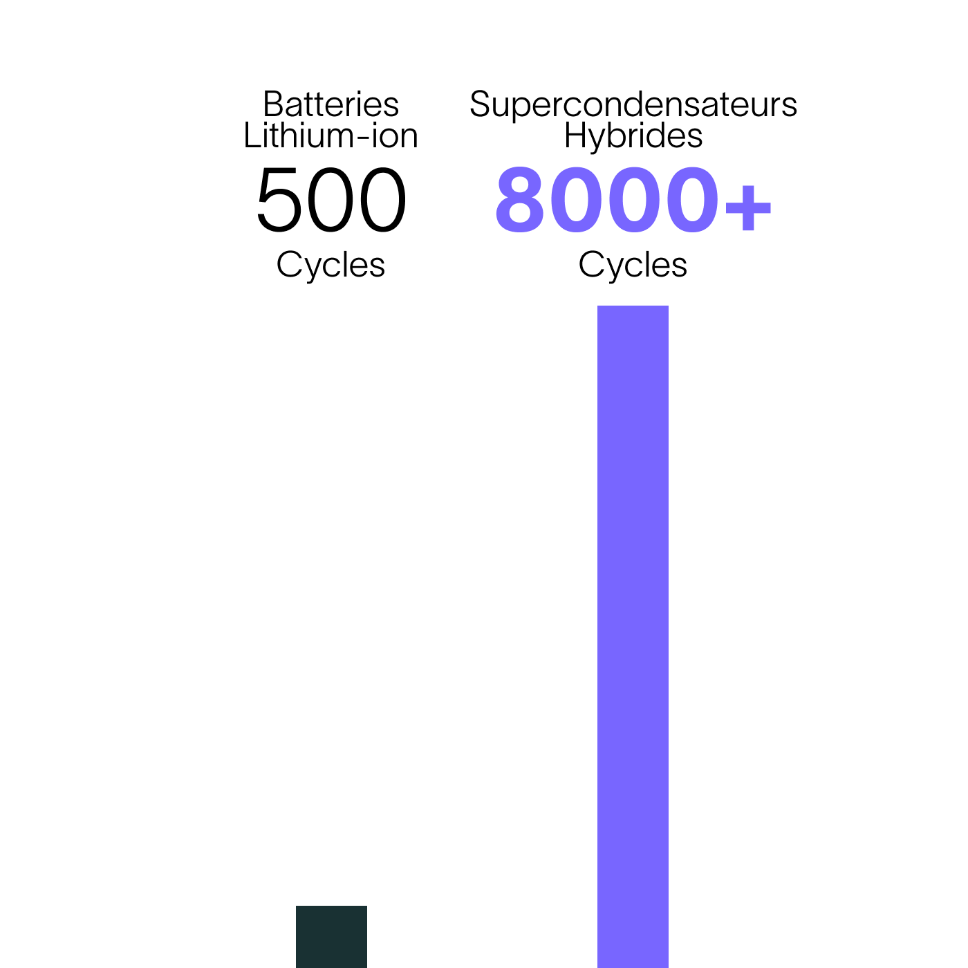 Les supercondensateurs hybrides offrent une densité énergétique légèrement plus faible. Mais grâce à notre système complet (moteur, électronique, gestion énergétique), nous atteignons une autonomie équivalente, avec en plus un rendement supérieur et une recharge bien plus rapide.